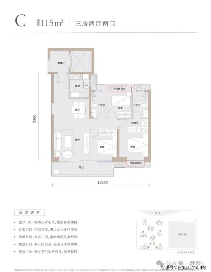 南面全部为低密洋房,北面依旧是高层、超高层,楼栋为东南朝向,其中2栋高层(T9、T10#)、2栋超高层(T11、T12#)是一线看江,高层、超高层都规划了风雨连廊。