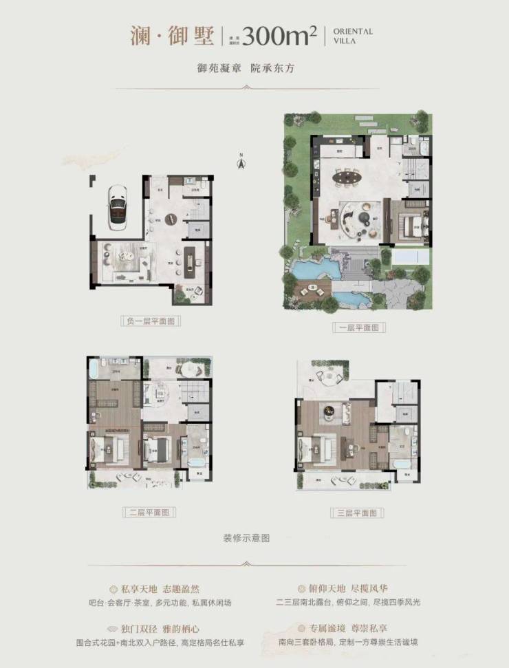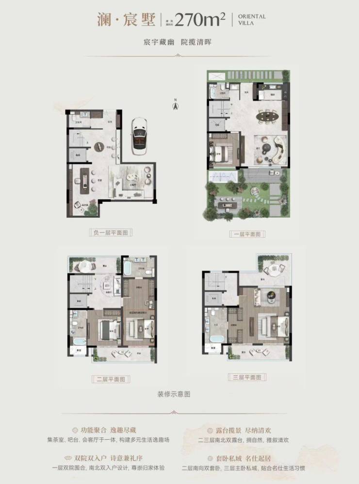 户型设计上,大面宽、多套房、南北双入户等核心优势,突出了院墅产品的人居体验,又通过私家花园、多层双露台等附赠空间,加倍提升产品实得率,也为高净值客户塑造了尊崇的归家礼序、融于自然的立体生活场景以及通透舒适的人居环境。