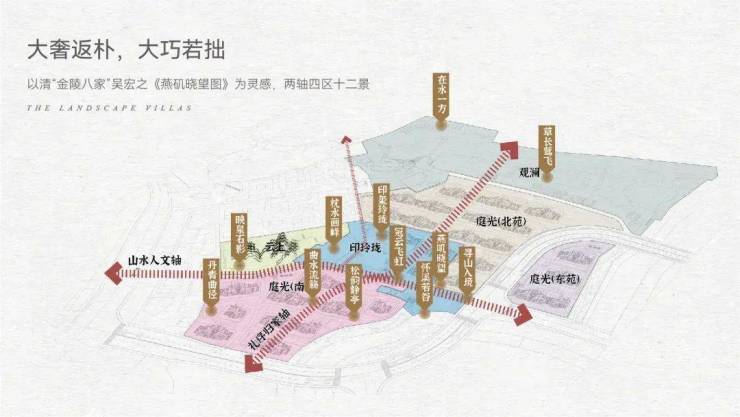 江悦堂依循传统文化与东方美学的园林景观手法,以清代“金陵八家”吴宏《燕矶晓望图》为造园蓝本,参照世家门庭礼序,精心雕琢“两轴四区十二景”,草木亭廊、层层递进,丰富内在景观层次,绘就一幅山水意境的生活画卷。