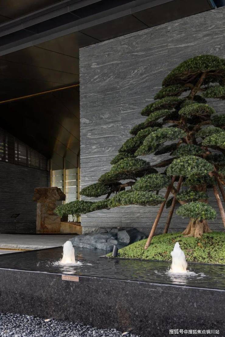 创新下沉庭院,结合叠水与高差,形成“峰谷”意象。水流层叠跌落,其声淙淙,望峰息心,窥谷忘返,隐喻家族如山水般源远流长的气度。