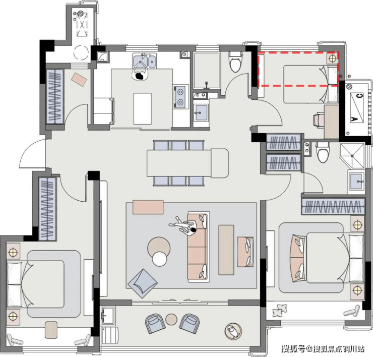 最后一个建面约142㎡的户型,展现出了更加极致的尺度,约14.9米开间,3卧朝南格局实现了阳光平权,再不用为父母和孩子谁住朝南卧室而纠结。
