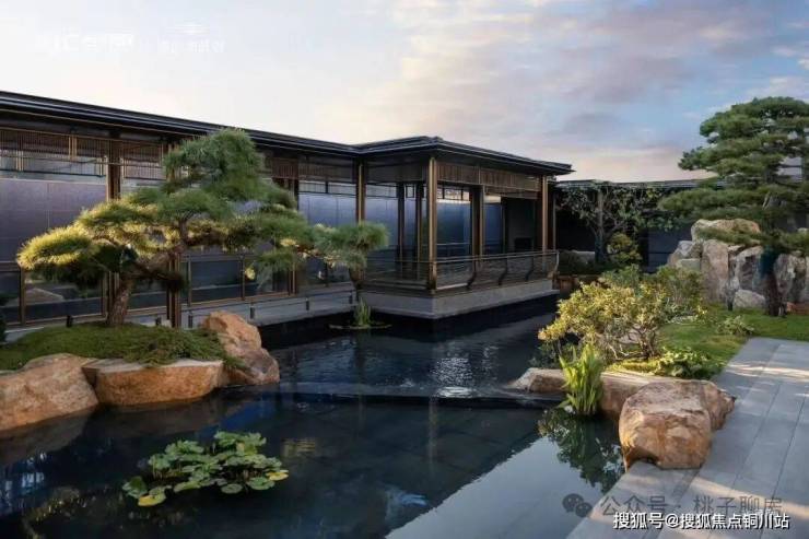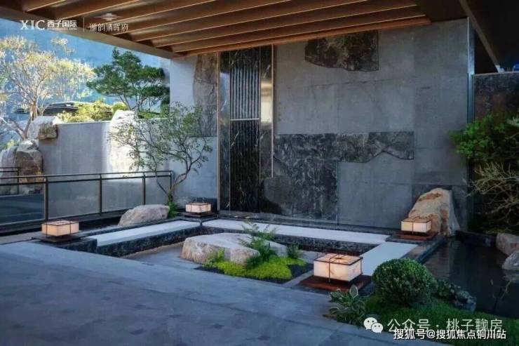一般的大门都是直接连着入户大堂,但这里居然嵌入了一个方方正正的下沉式卡座,背后是流水潺潺,眼前有亭台游廊。