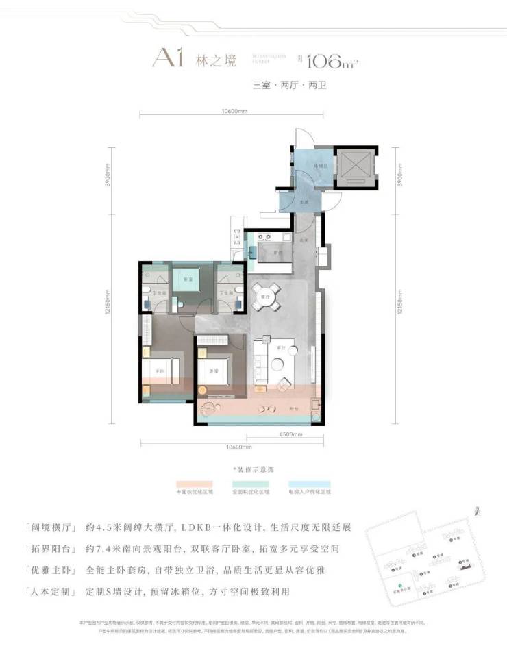 建面约106㎡户型,实用面积相当于三代120㎡+户型,让首改客户无痛实现置换+居住空间升级。