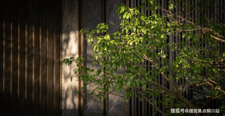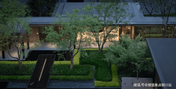 中庭树种以造型乌桕为主,点缀丛生香樟,连廊掩映其中。水庭中景为孤植的造型乔木,另一侧的奢石水台伸入水庭之中,结合精致雕塑和线性喷泉,使得场景更加生动。