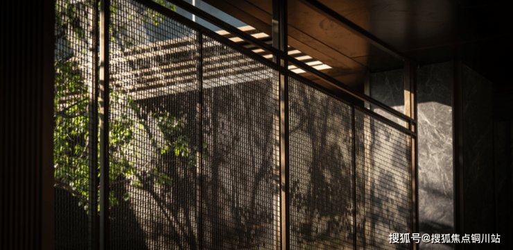“雅奢假日水庭”——空间采用先抑后扬的处理手法,在穿过“叠影之庭”,而后经过水帘,两个视线相对遮蔽的空间后,最终方觉豁然开朗,到达开阔的核心水庭。空间关系有虚有实、光影明暗转换富有趣味性,游廊空间于一侧设置金属帘,引导游人的视线聚焦于水庭空间。