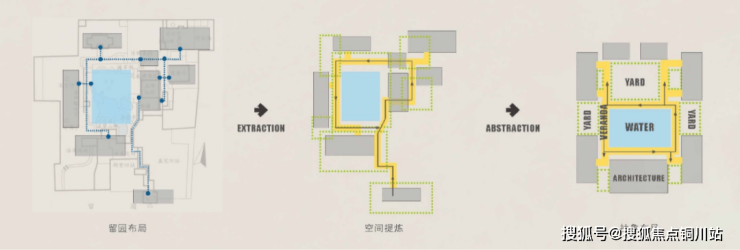 造园手法:注重大空间与小场景的交融,在对全区的空间布局和动线设计之前,设计回归到中国古典园林的造园技法中,研究选取苏州留园的园林美学与归家礼序。提炼出:"中景"为主导、“理水”为要素和洄游性体验三点作为本项目园林布局的主要手法。