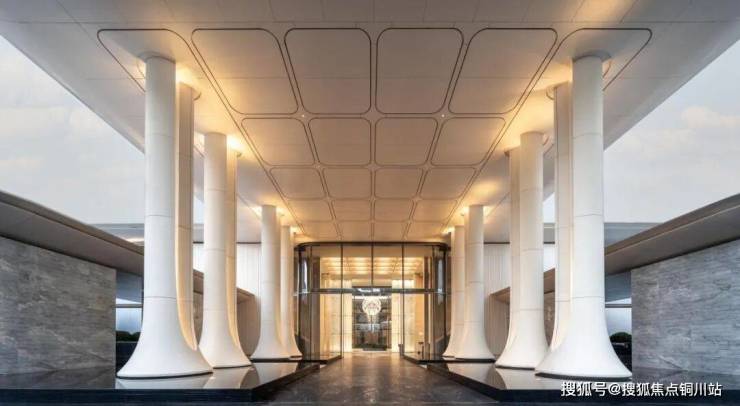 入口处,8根纯白巨型立柱,将大堂空间向上整体托举至10.5米的高度。无论是天光倾泻,还是夜幕低垂,圆与方、天与地,都形成一种极具冲击的空间秩序感。