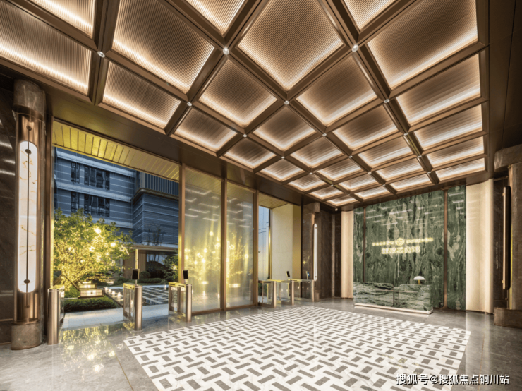 电梯古铜色不锈钢到顶,轿厢内装饰的奢石岩板,与公区一脉相承,形成统一的视觉美感。