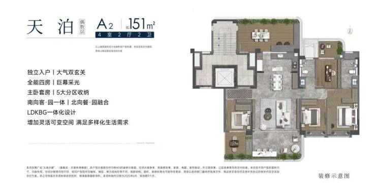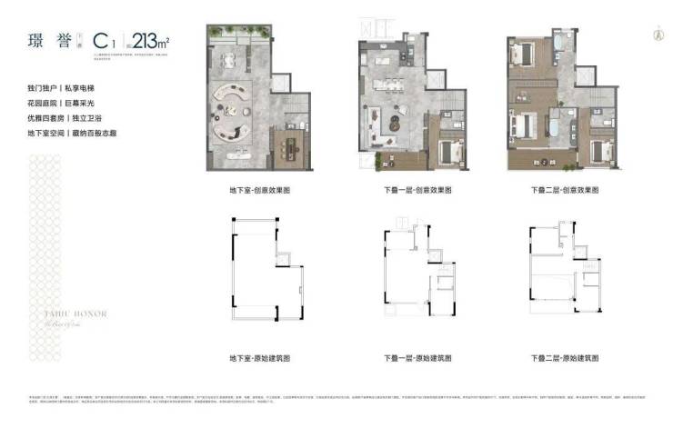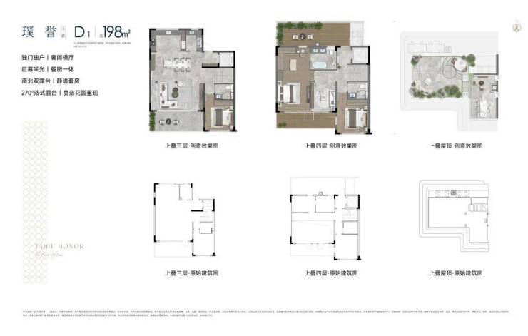 四代洋房户型151-183㎡,户户花园,空中庭院,南北阳台+露台;上叠建面约198㎡、下叠建面约213㎡;
