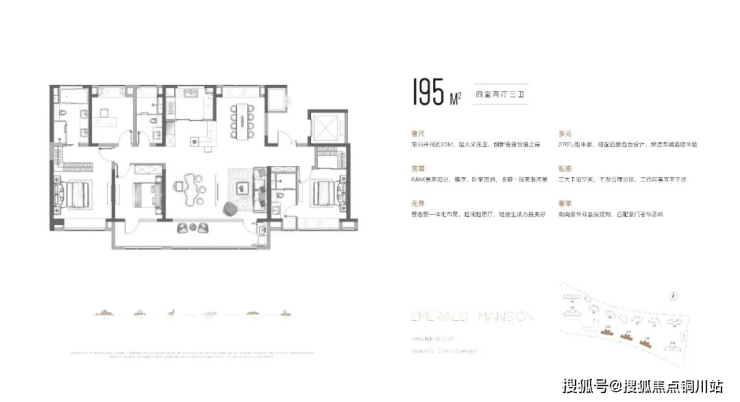 实体样板间是面积约196㎡四房三卫,整个南向有约19米开间。最关键的是,三个卫生间全是明卫。