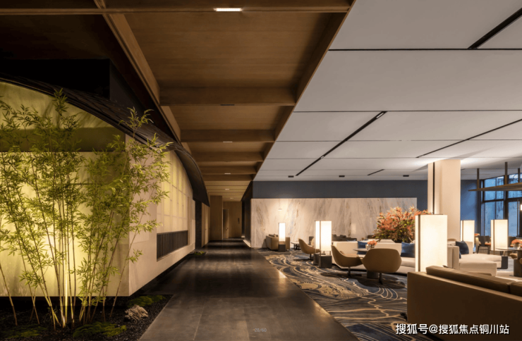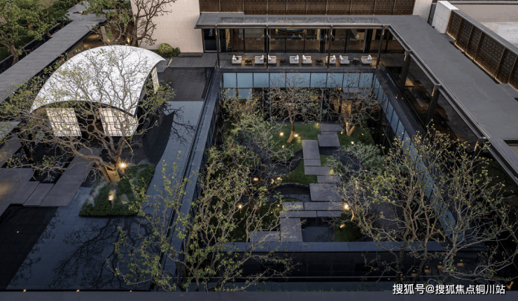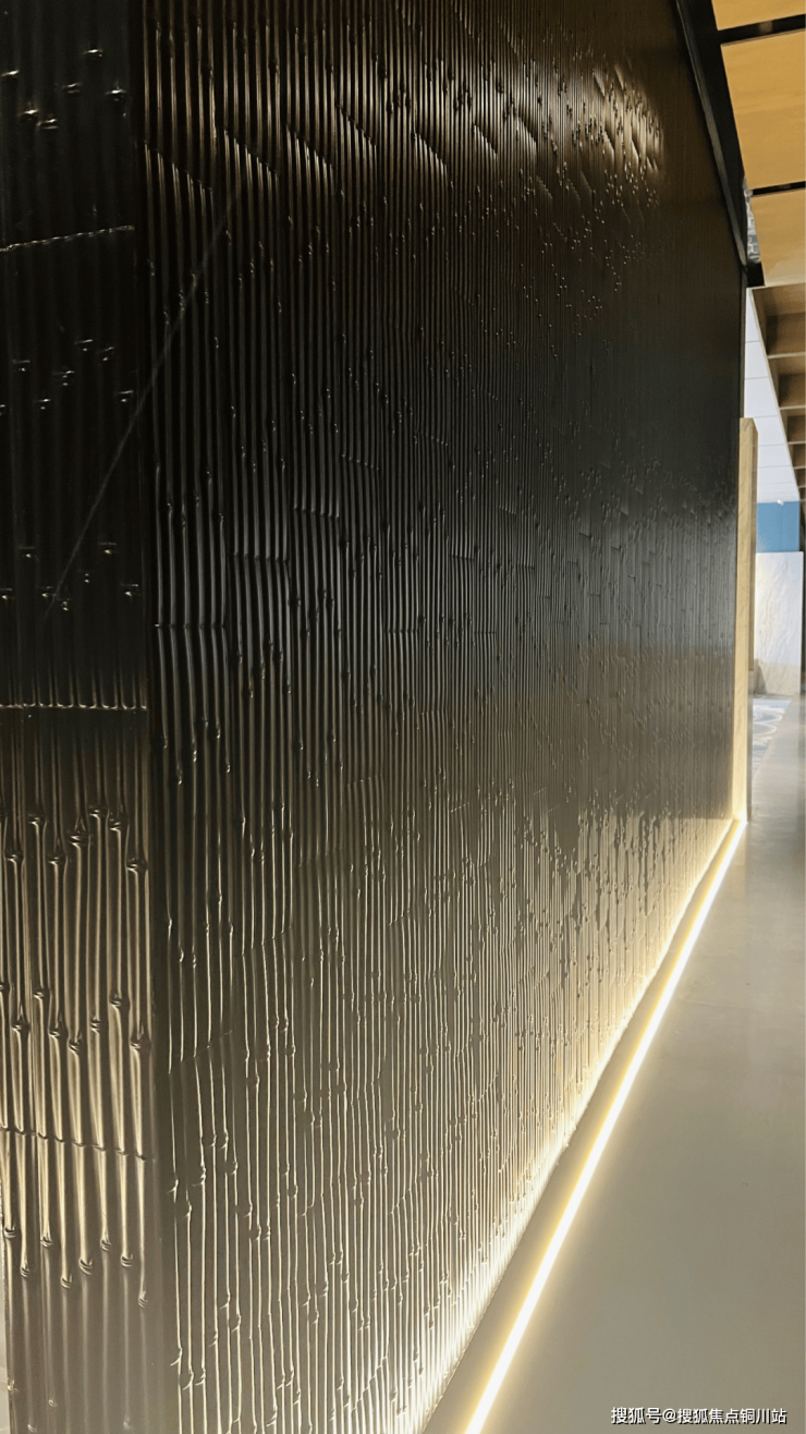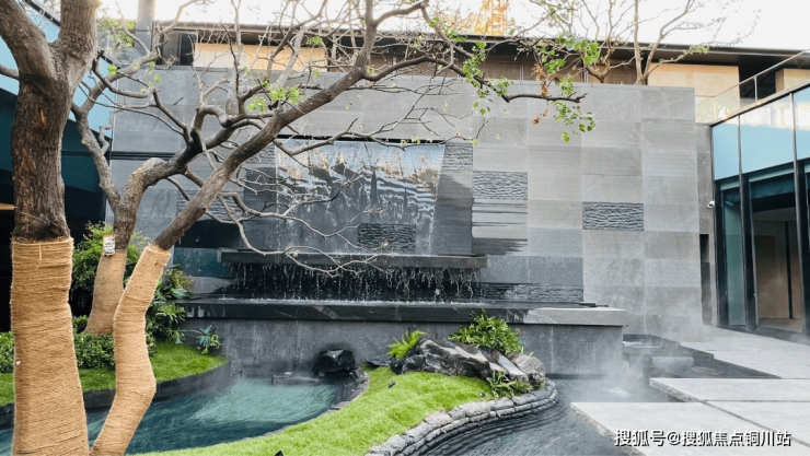 比如,迎宾水院采用东湖石干挂工艺,运用山水形意打造叠瀑式水景,飞瀑直下,营造高山流水人文意境,开门见水也代表灵气与聚财之意。
