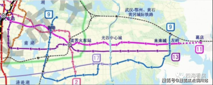 地铁与公交:项目距离2号线黄龙山站和在建的11号线关山大道站约1.9公里,都不算近,规划中的地铁13号线线路预计沿南湖大道通过,正好在项目南面,距离项目比较近,还有一条线路9号线,和13号线在南湖大道上换乘,最新消息13号线和9号线都将纳入第五轮建设规划。