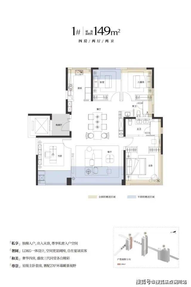 该户型为东边户,临和平大道,南北通透,三面采光,三开间朝南。该户型带独立电梯前室,南北三个阳台,均可优化一半空间;除带阳台房间外,其它房间均有飘窗空间拓展,其中,南向主卧和北向儿童房还能做到双面飘窗优化。该户型是“类四叶草”结构,走道面积少,不过动静分区不佳。