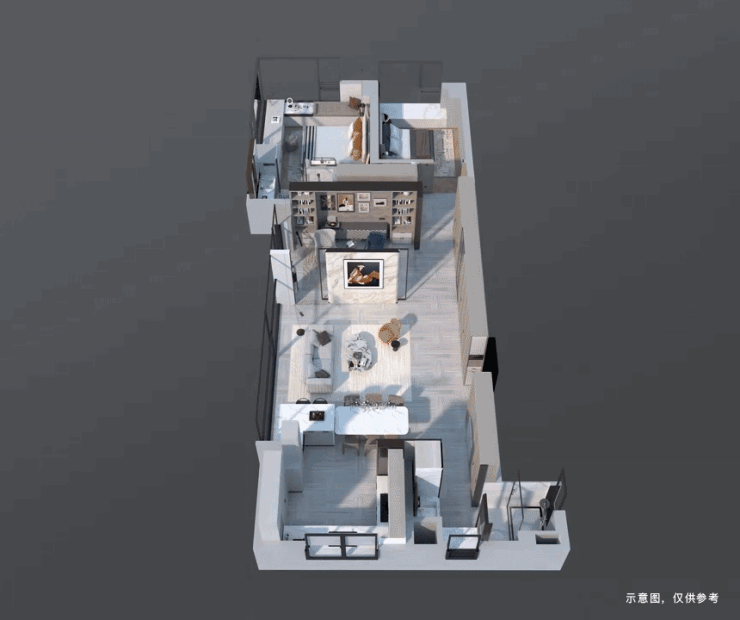 在空间规划上,该户型也突破了同面积段的常规设计标准。约6米的横向客厅可将阳台区域纳入室内,进一步拓展公共空间,若结合灵动空间进行优化,可形成面宽约8.8米、总面积超40㎡的一体化社交区域。