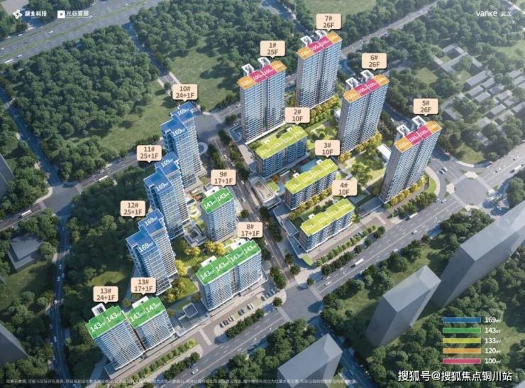 从鸟瞰图来看,有3栋是小高层(10F),有3栋是带空中花园的真四代住宅,阳台和空中花园的面积为全赠送,产品全系层高3.05-3.15米。
