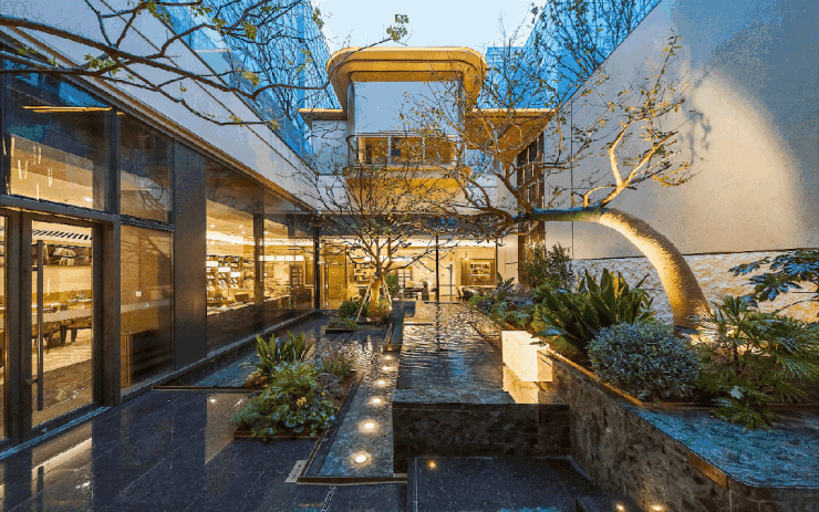 宝格丽绿,镶嵌与下沉庭院水景处,如翡翠一般的自然纹理,与自然景观碰撞出妙趣横生的视觉感受。