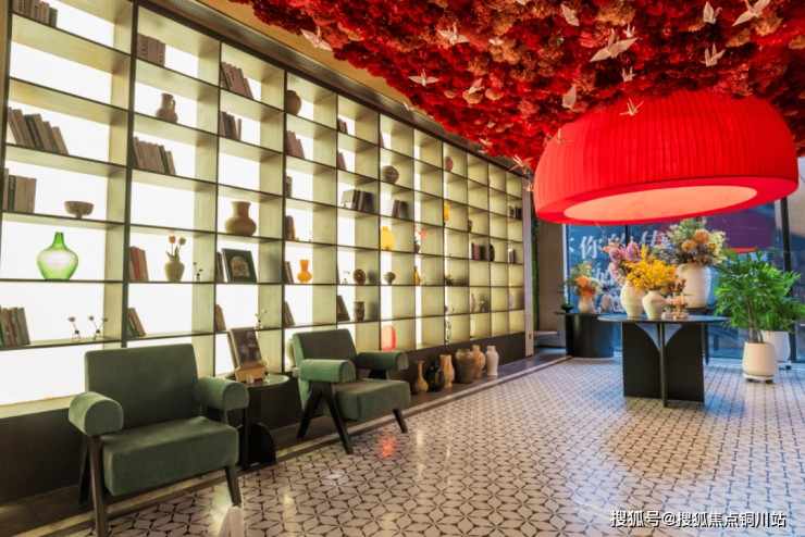 约97米长江波纹景墙静静伫立,艺术中轴水景采用整块「普拉达绿奢石」凿刻而成,艺境花园通过「黑松盆景矩阵」布局山水长卷,并巧妙融入了老船厂的工业记忆——地面镶嵌的铆钉工艺样本,提升了整体质感。