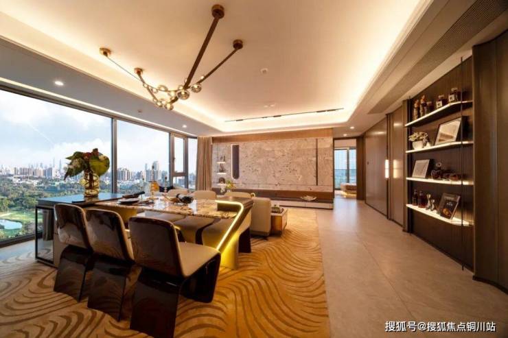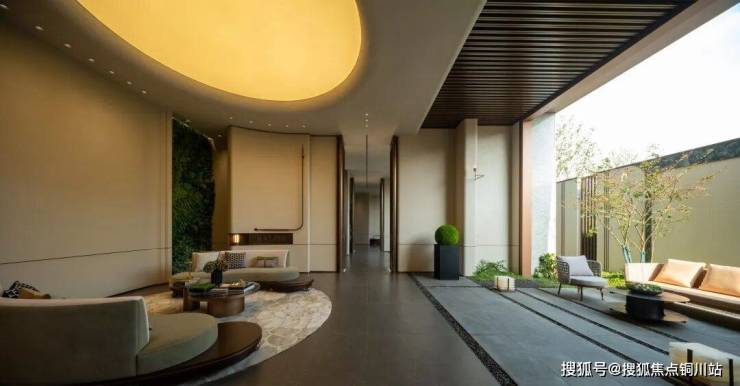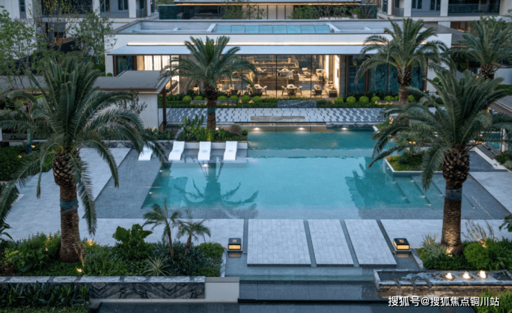 外立面与公区:采用 三面铝板+270°曲面玻璃(供应商为深圳南玻),顶部弧形塔冠设计,成本较常规住宅高约30%。示范区铺装 普拉达绿奢石超4000㎡,入口黑山石单块重26吨,泳池旁配6棵 加拿利海枣树(单棵价值8万+)。