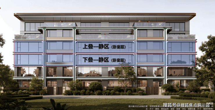 上叠则拥有双层露台和北院,三层(上叠一层)为静区,避免下叠动区干扰,四层、五层设计出挑空客厅「4.5代住宅」连通露台。