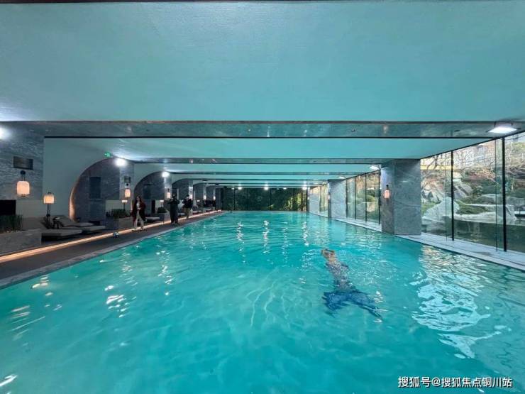 业主游泳的时候,透过全景玻璃幕墙,可以看到山水瀑布的自然风景。
