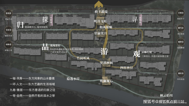 华润置地·知屿雲璟借鉴宋画《四景山水图》的移步异景理念,并效法宁波「天一阁」三进院落格局,选用灵动的轴线递进式排布,独创了「一带一轴一环九巷」立体园林: