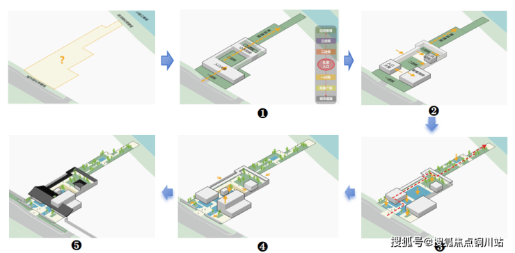 传统纵向展开的归家礼序空间(如下图❶),往往与城市绿化带景观割裂,社区内的园林景观也被切碎。