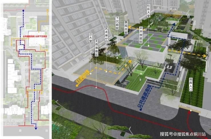 不少于15米宽的步行城市走廊,有机串联北侧地铁枢纽与湖北省博物馆、东湖风景区。将社区建筑作为重要节点,通过合理的动线组织和丰富的空间营造,既守护了归途的私属感,又承载了公共环境的社区共享,实现开放与私密的微妙平衡。