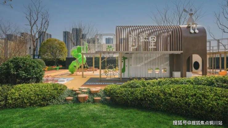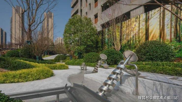 “穿水乐园”的溪流贯穿整个园林,跌水溪流、地涌喷泉、水滑梯、互动跳泉等设施分布其中,到了夏天,这里是孩子们举步即达的梦幻乐园。