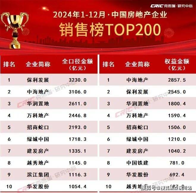据克尔瑞发布的《2024年1-12月中国房地产企业销售榜》,保利发展以全口径3230亿元的成绩,稳居榜首(数据来源:克尔瑞)。