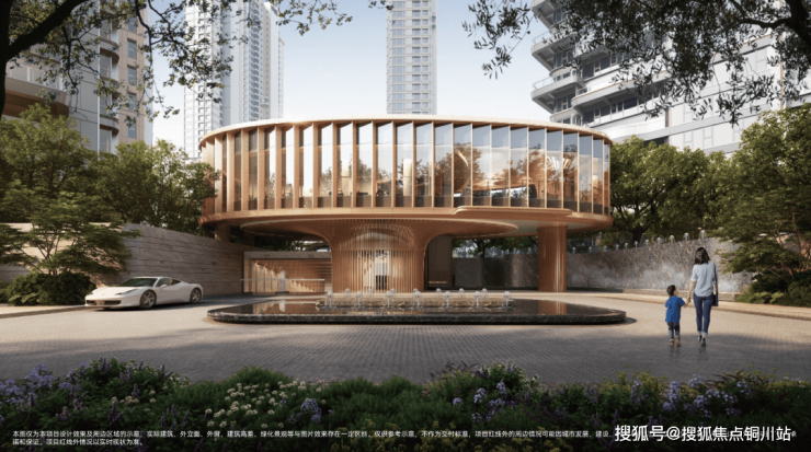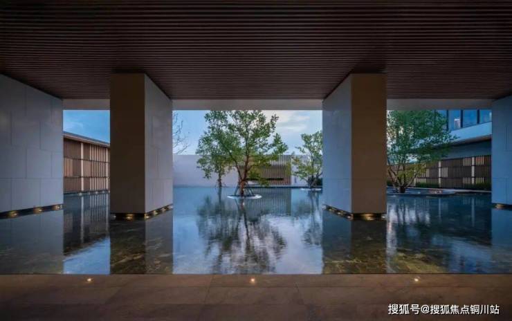 主出入口,做了独特的悬浮大堂设计,配合国际酒店式落客区、香槟金色大门与层层递进的水景,共同将城市的喧嚣隔绝在外。