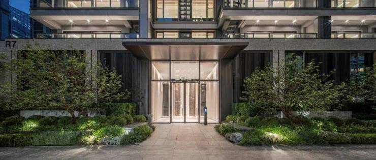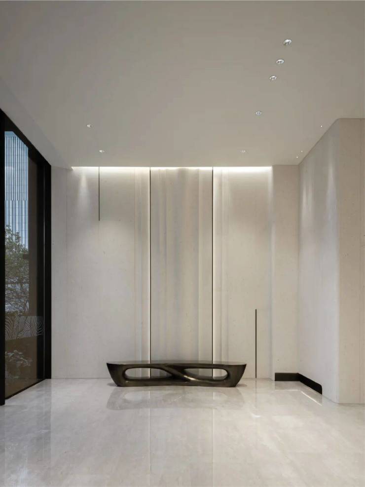 以当代美术馆为灵感,打造超尺度谧邸门厅。从街角步入,纯粹结构与理性比例,构筑出张力十足的艺术“生活前厅”。静谧、尊崇与归家仪式在此升华,每一次抵达,皆若步入凝练的艺术圣殿。