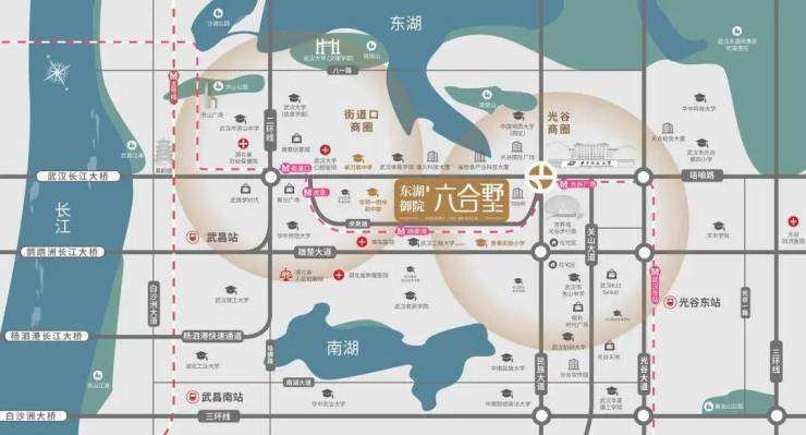 东湖御院·六合墅位于虎泉街杨家湾地铁站附近,在楼市划分中属于光谷广场板块,行政划分属于洪山区,属于三环内。