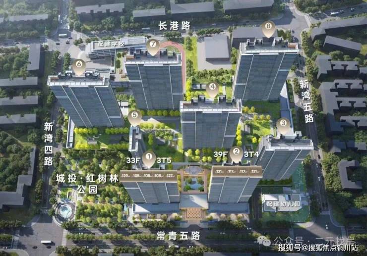 其中,1号楼,总高33F,3T5设计,西边户为独梯入户;2号楼,总高39F,3T4设计。