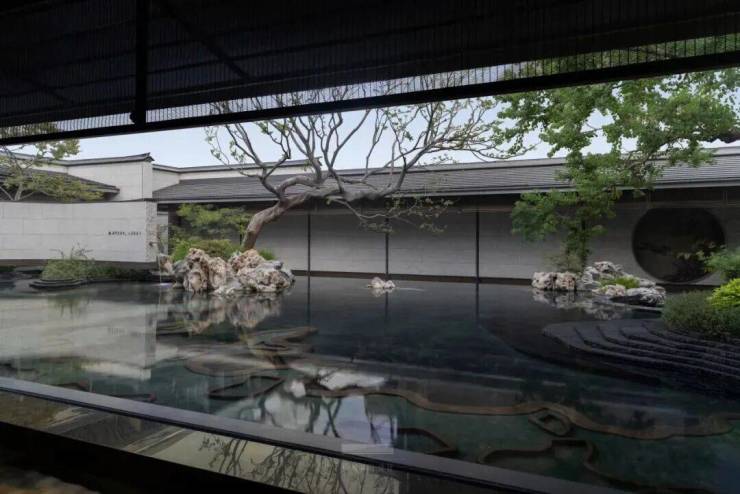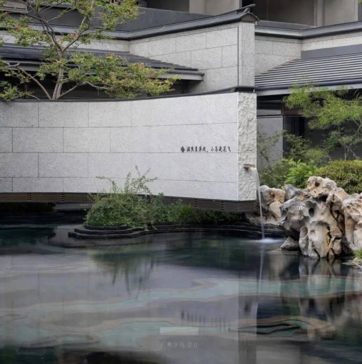 水庭左侧,一道弧形景墙如素绢轻展,悬浮于水面上。