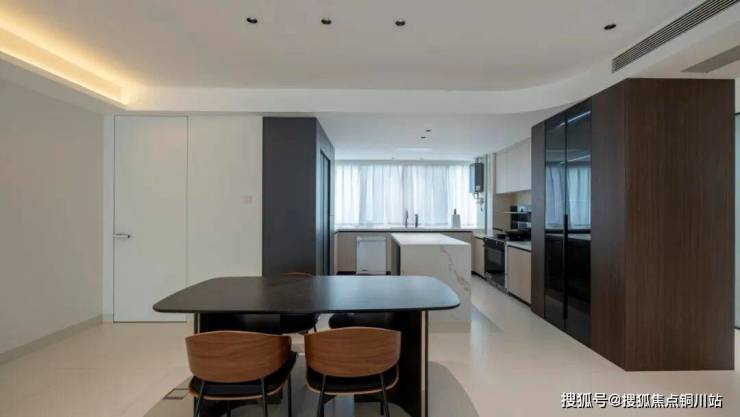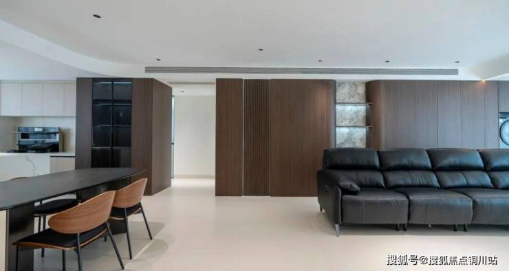 客厅餐厅与厨房无界相连,空间自由流动。沉稳沙发区、用餐区与现代厨房动静分区却和谐共生,木质与黑白配色交织,诠释开放生活的诗意与功能美。