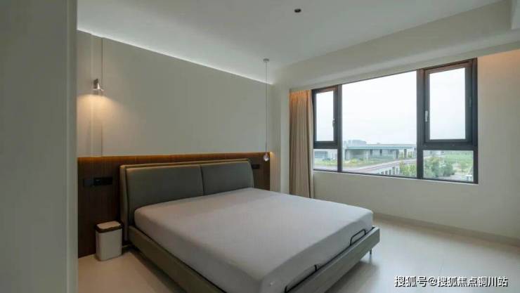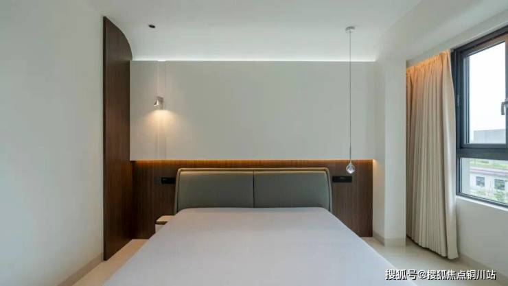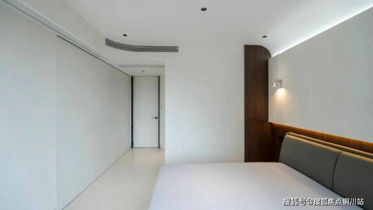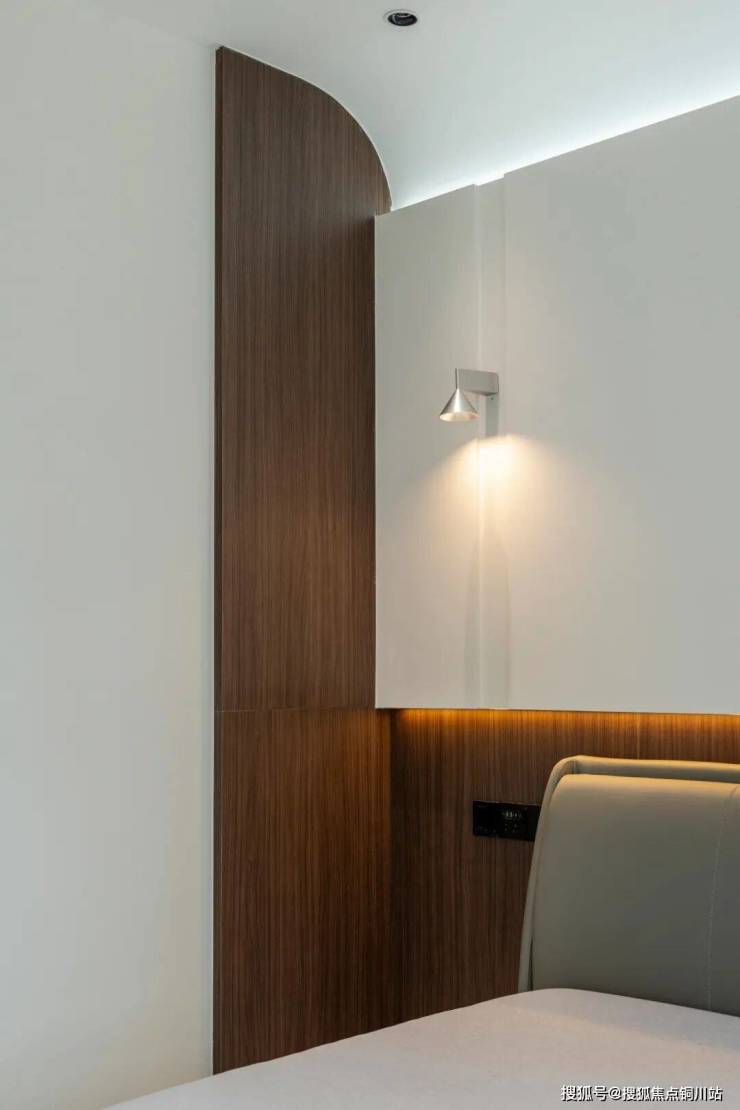 卧室空间以极简笔法勾勒宁静,浅灰床品与木色背景墙相融,嵌入式灯带与壁灯共筑柔和光影。