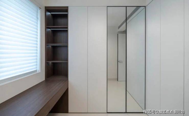 衣帽间巧妙嵌入镜面与白色柜体,延续整体清新基调。窗下一组开放柜体+书桌又兼顾了书房功能,窗外景致若隐若现,为现代简约氛围注入自然呼吸感。