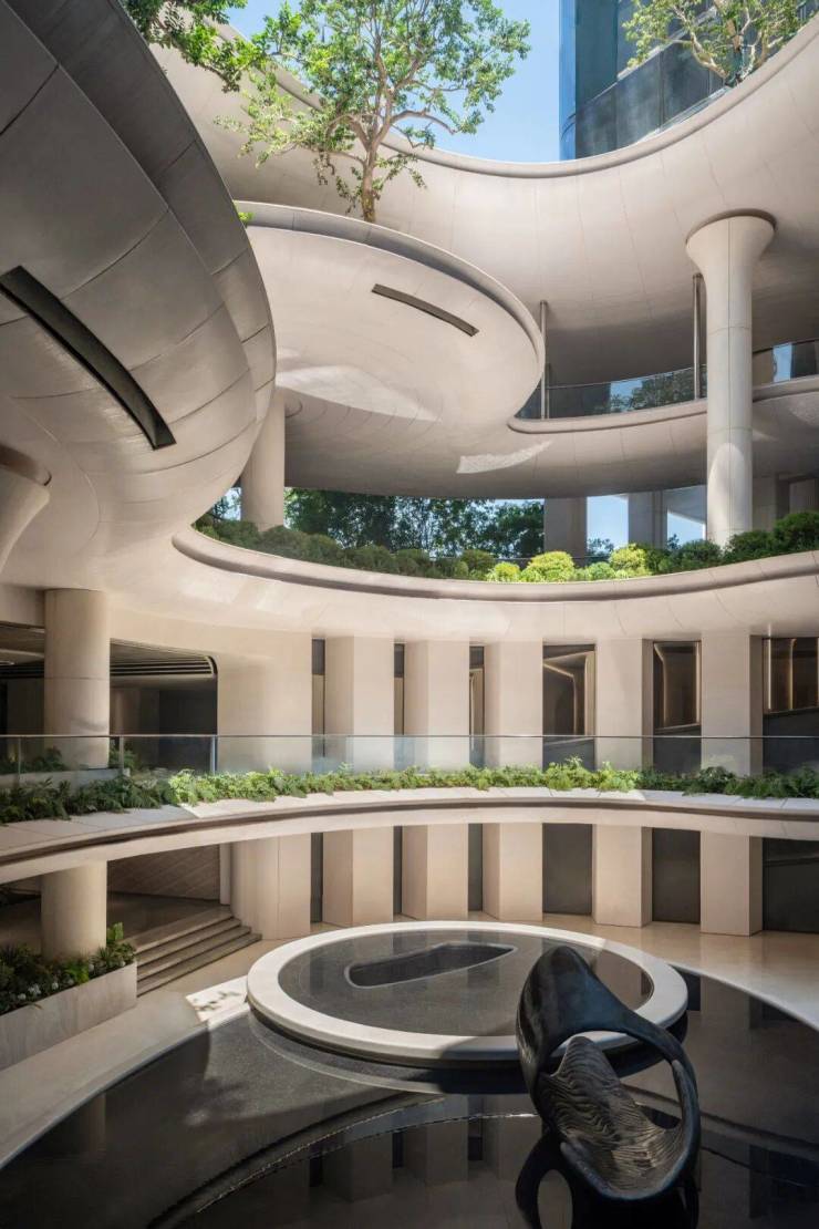 云梦大泽的立体森境,以美术馆的营造思维进行场景布置,让潺潺的流水从天而降,2楼纯架空的高线花园设计,将绿色引入到空中,形成多层次的景观。后场庭院引江入园,让居者可以私享长江的设计活力。