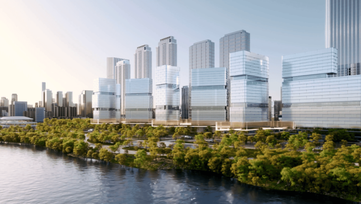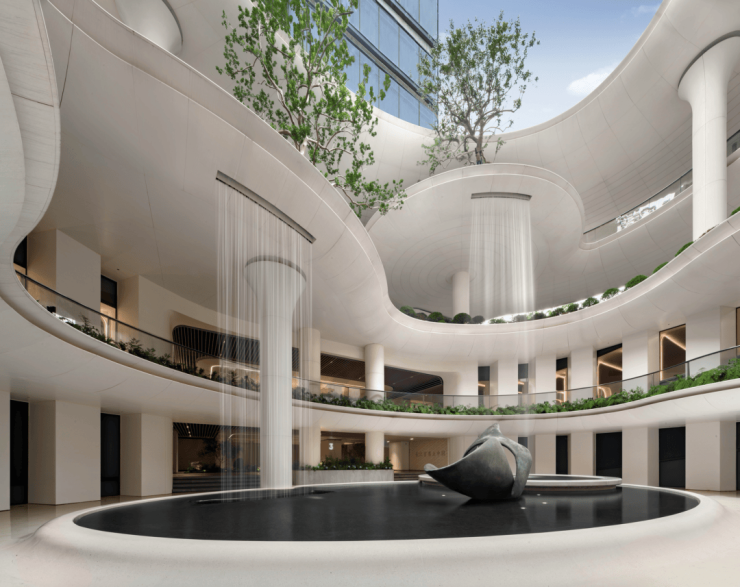 飘逸错落的建筑群落,灵感来自宋代《水图十二》中的《长江万顷》,勾勒“清风拂大江”的意境,将涟漪笔法运用到建筑立面上,在其上层层漾开,构成江河意蕴。