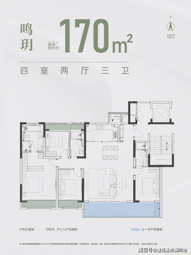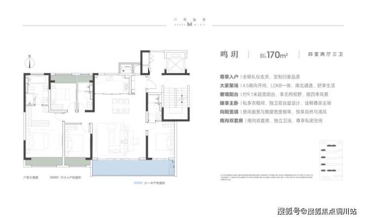 以建面约170㎡户型为例:四房两厅三卫,4.5开间朝南设计,奢享约16.3m南向大面宽,其中双联阳台宽约9.1m,采光面充沛,空间通透明亮。