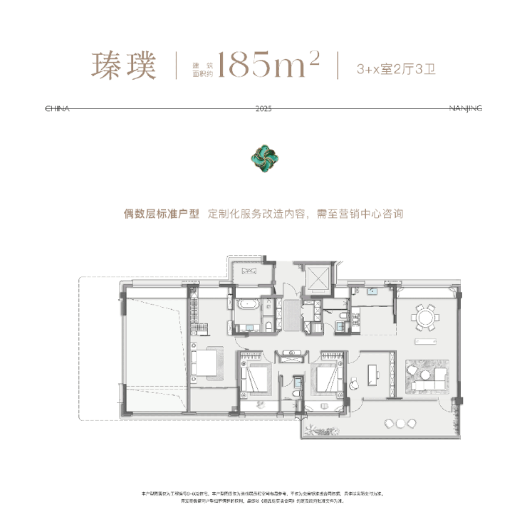 第五,南向双套房(主卧套房带独立衣帽间+两间次卧连通一个次卫可作为亲子/二宝套房)+三明卫,又不动声色的优秀了。谁说185㎡的业主主卧不能拥有独立衣帽间,这个楼盘第一个不答应!