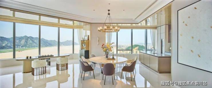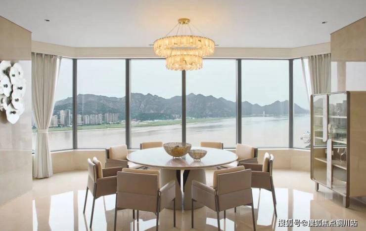(建面约)665㎡做了五房二厅四卫,每个房间都把山岚请进窗框,将流水谱成画卷。由双开装甲门进入,映入眼帘的是(建面约)150㎡的餐客厅,约270°的瓯江像千里江山图一样铺展在你眼前,