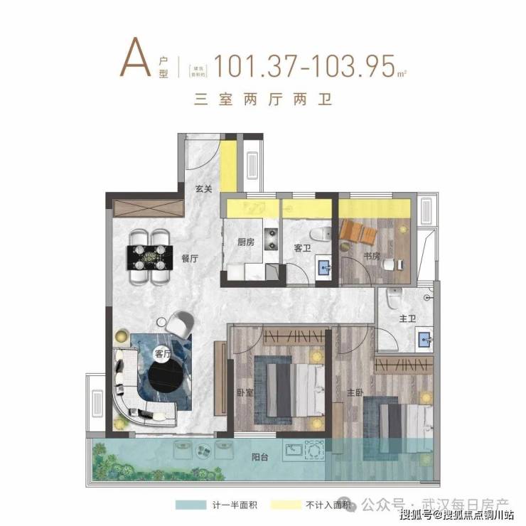 1、5、6、7#A户型建面约101-104㎡