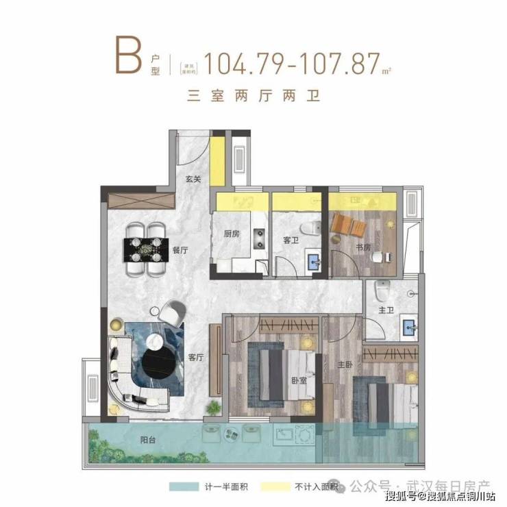 2、3#B户型建面约105-108㎡三房