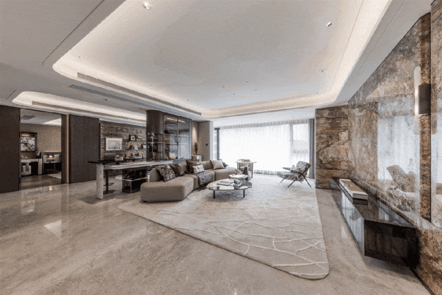 在入户便用上了整块奢华花岗岩,室内大面积的石材与岩板,搭配温润的木饰面,空间的张力与舒适感在冷暖之间达成平衡。