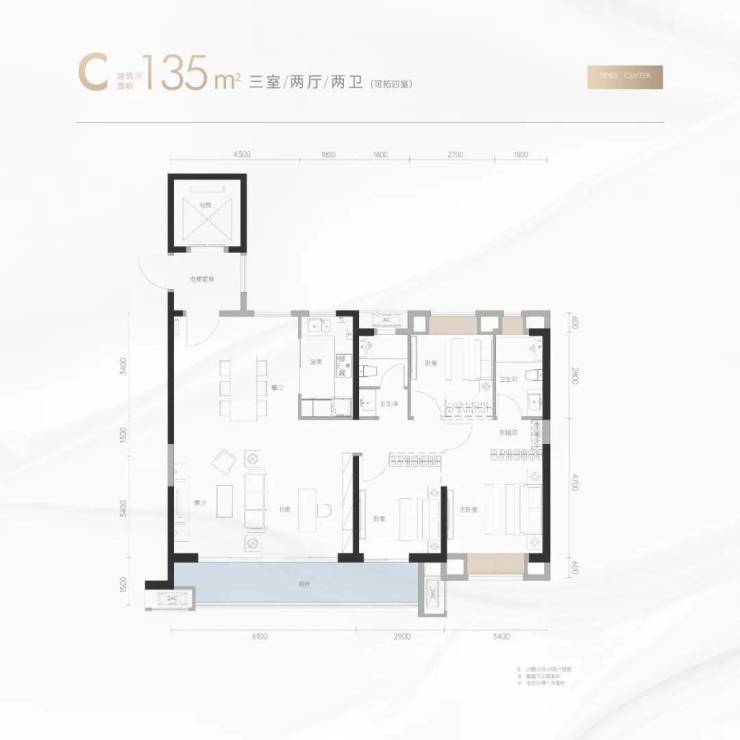 是个尺度奢阔,“成长性”极强的产品。电梯入户,“独享”约5㎡的电梯前室空间。餐客厅与阳台贯通,豪华大横厅的气场拉满。