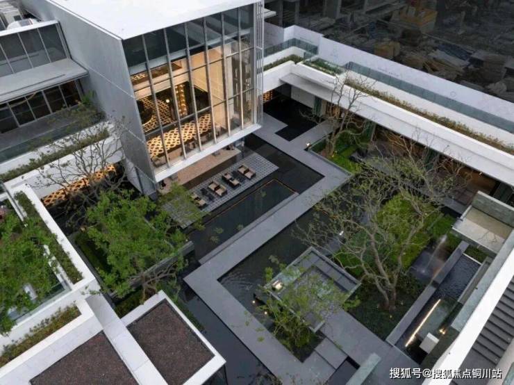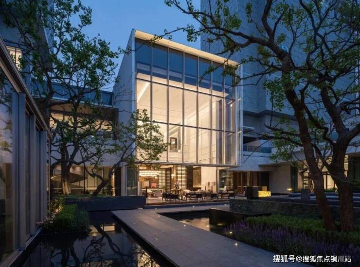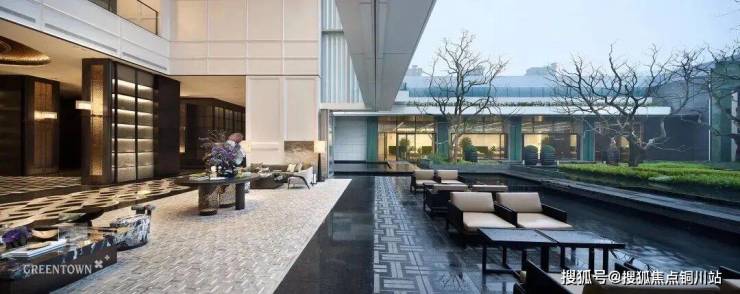 大堂的挑高约15米,作为回家的过渡空间,连接着会所和下沉庭院。下沉庭院面积约960平方米,设计灵感来源于山水城市,巧妙地设置了六个叠瀑和五道豪华的石片墙。庭院内种植了大量树龄约50年的乌桕,这些树木是从全国各地精心挑选而来。曲水流过,留下芳香,游走其中,宛如置身于“独自洗涤苍苔注入云壑,白鹤飞翔绕过青云”的闲适意境。