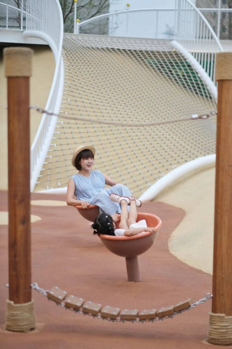 两侧的攀岩坡道,能够锻炼孩子们的勇气。成长就是不断攀爬向上的过程,累了停下歇歇也没关系,半路的风景也不错。