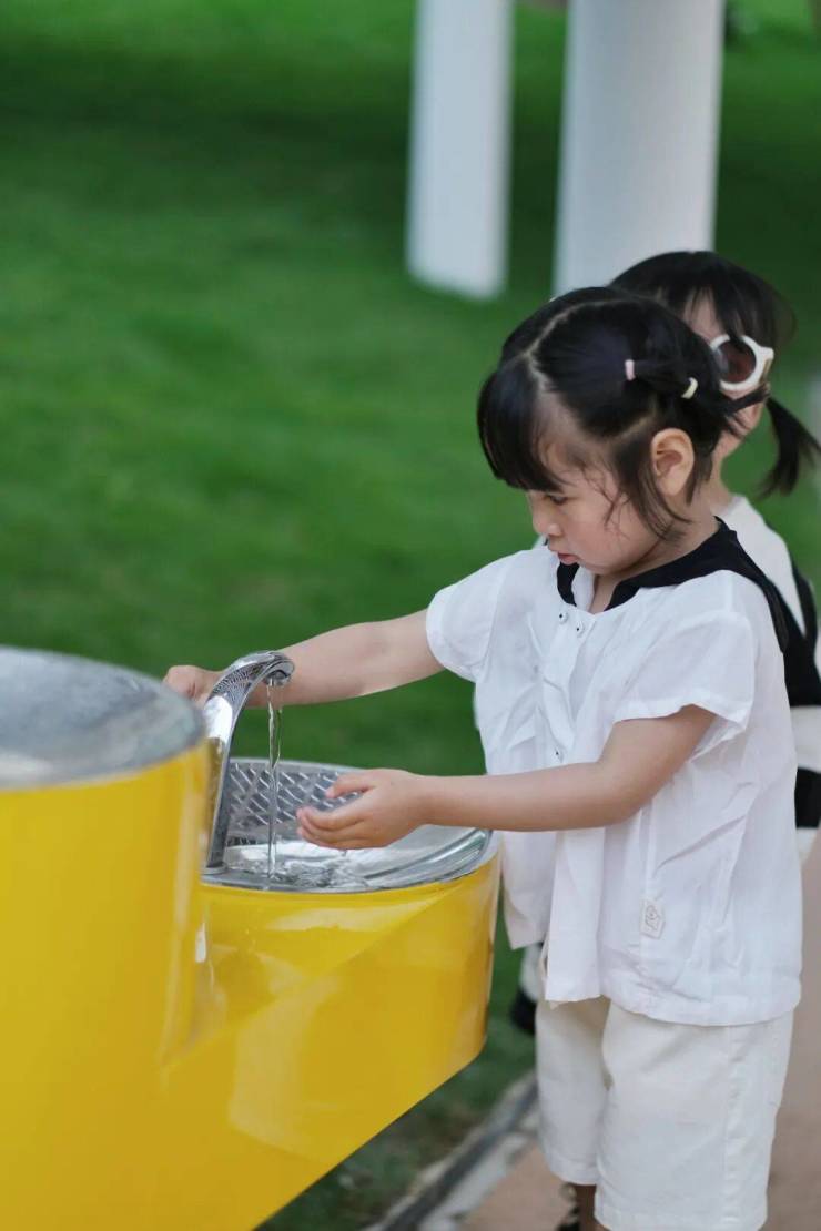 出入口没有限定,栏杆做了圆弧处理,为家长、孩子们提供户外直饮水、驱蚊灯以及专门的婴儿车停车位等,这些人性化设计更多的考虑使用场景的便利,给予居民一个安全舒适的环境。