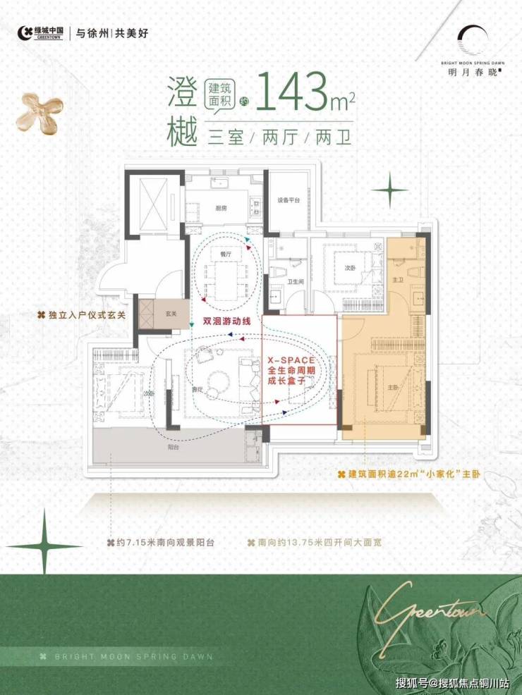 建面约143㎡3+1室户型:独立玄关、约13.75米四开间大面宽,南向约7.15米超长阳台,采光超棒,宽敞明亮不压抑;“小家化”套房主卧,品质生活一步到“卧”;X-SPACE百变空间,卧室、书房、健身房……随你喜欢,随心改造。